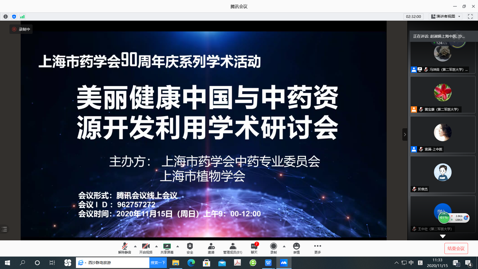 2020年11月15日由上海市药学会中药专业委员会与上海市植物学会通过线上会议形式共同举办了“美丽健康中国与中药资源开发利用学术研讨会”。参加会议的代表来自上海市药学会中药专业委员会以及生药专业委员会、老年专业委员会委员和会员,上海市植物学会的理事和会员,以及从事中药及植物资源相关研究领域的同行和研究生共90余名。中药专业委员会主任委员徐宏喜教授作开幕式讲话。会议邀请了6位专家学者对中药资源可持续利用与健康中国、美丽中国,青山绿水与生态保护等主题内容进行了报告交流。成人在线 院长徐宏喜教授“健康美丽话人参”的报告,风趣而生动地介绍了人参的资源、品质、临床应用以及课题组的研究成果,让大家对人参的认识更进一步。