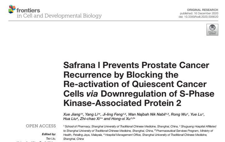 该研究成果“Safranal prevents prostate cancer recurrence by blocking the re-activation of quiescent cancer cells via downregulation of S-phase kinase-associated protein 2”于12月16日在《Frontiers in Cell and Developmental Biology》杂志上发表。该研究主要发现包括:1)西红花醛能够抑制静止期前列腺癌细胞的再次增殖。 2)西红花醛通过调控细胞周期相关蛋白的表达,使前列腺癌细胞阻滞在G0/G1期。3)Skp2为西红花醛发挥抑制作用的主要靶点。4)西红花醛调控Skp2的主要作用机理是通过下调IKK/NF-κB和AKT信号通路,分别抑制Skp2的两个转录因子NF-κB和E2F1的转录活性和蛋白表达。5)西红花醛能够抑制静止期PC-3细胞裸鼠皮下移植瘤的生长,具有延缓前列腺癌病程发展的作用。该研究阐明了西红花醛抑制静止期前列腺癌细胞再次激活的分子机理。