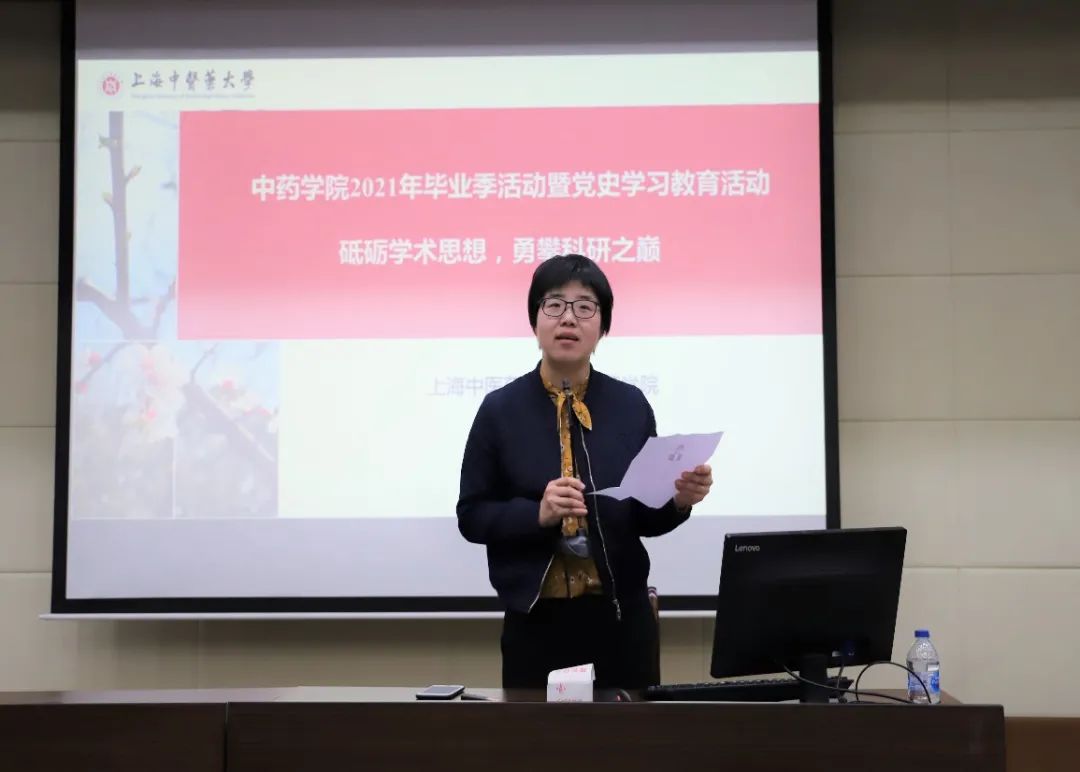 56日,成人在线 在教学楼6501教室举行成人在线 2021毕业季主题教育活动暨党史学习教育第三场讲座《砥砺学术思想,勇攀科研之巅》,会议由成人在线 党委副书记沈漫主持。会前沈书记介绍了本次的主讲人黄容琴教授,黄容琴教授系复旦大学药学院教授,博士生导师,国家优秀青年科学基金获得者。沈书记就黄教授的科研履历、课题研究、学术兼职等向同学们做了详细的介绍,希望广大毕业生在今后的的科研求学中积极进取、锐意创新,不断创新中药研究,用更高质量的科研成果推动中医药的现代化研究。