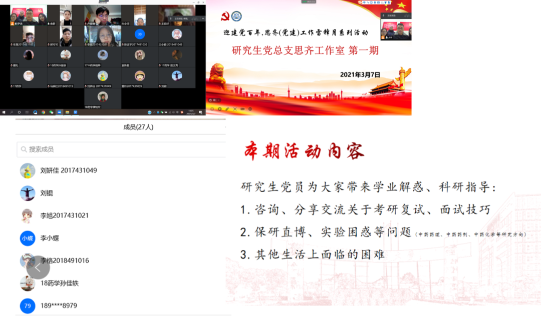 2021年3月7日晚,四名研究生党员齐聚16幢19号一楼的思齐工作室,面向成人在线 本科学生,开展第一次线上交流指导活动。在主持人吴龙龙的带领下,组员金诚、郭静雯和李强提前来到工作室,调试线上系统,布置交流现场,并成功和线上辅助答疑的刘锟、余群、李小蝶、郭可可等党员团员通话,协商解答内容。