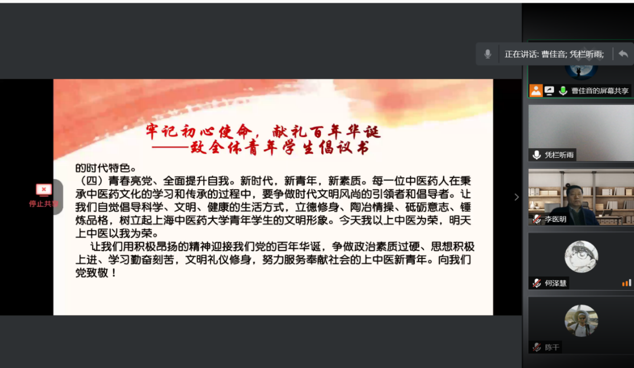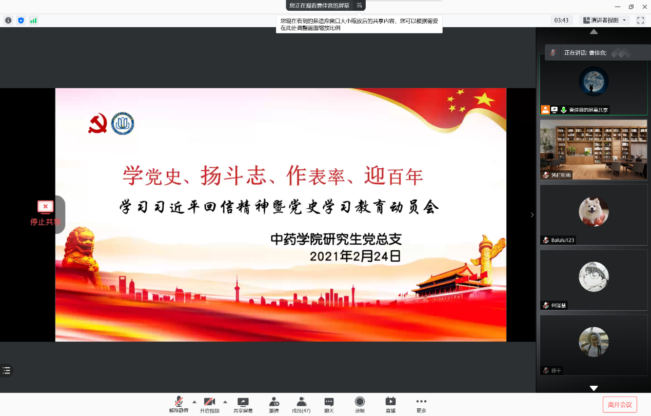2021年2月20日,党史学习教育动员大会在北京召开,习近平总书记强调,在全党开展党史学习教育,全党同志要做到学史明理、学史增信、学史崇德、学史力行,学党史、悟思想、办实事、开新局。为庆祝中国共产党百年华诞,号召中药学子牢记初心使命,倡议全体青年在新时代接续奋斗,以党史学习教育动员大会为遵循,2月24日,成人在线 研究生党总支举行党史学习教育动员大会,成人在线 党委书记李医明老师,党委副书记沈漫老师,研究生党总支书记陈秀兰老师出席,会议由总支组织委员曹佳音主持,研究生党总支全体党员参会。