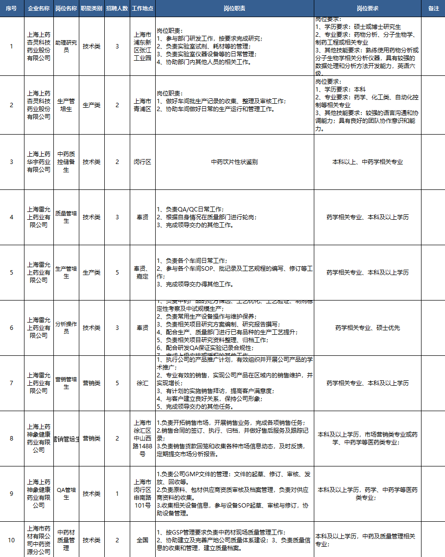 宣讲企业:上海市药材有限公司、上海雷允上药业西区有限公司、上海和黄药业有限公司、四川新绿色药业科技发展有限公司、中国医药工业研究总院上海益诺思生物技术股份有限公司