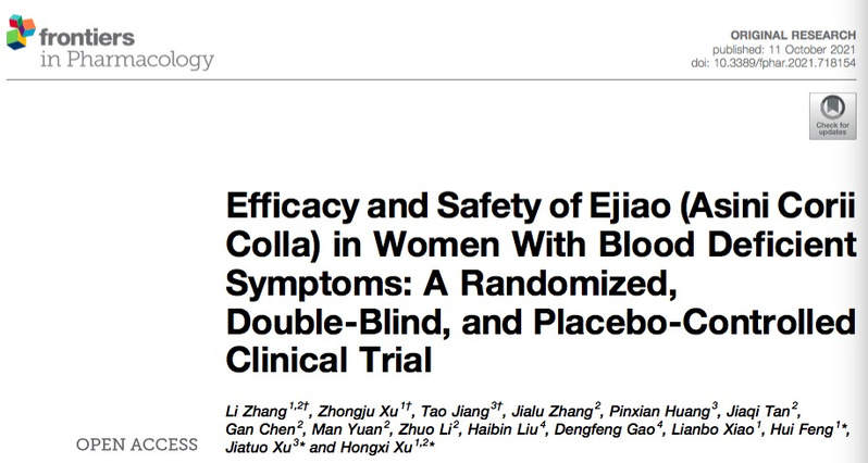 阿胶由动物驴的干燥皮或鲜皮经煎煮、浓缩而成。其具有补血、滋阴、润燥、止血安胎的功效,自古被列为上品中药,有“补血圣药”之称。近日,首席教授徐宏喜团队与附属光华医院肖涟波团队合作,首次利用随机对照双盲临床试验对阿胶治疗血虚患者的疗效和安全性进行了系统的研究。该研究结果表明阿胶对血虚症有很好的治疗效果,且无明显不良反应。