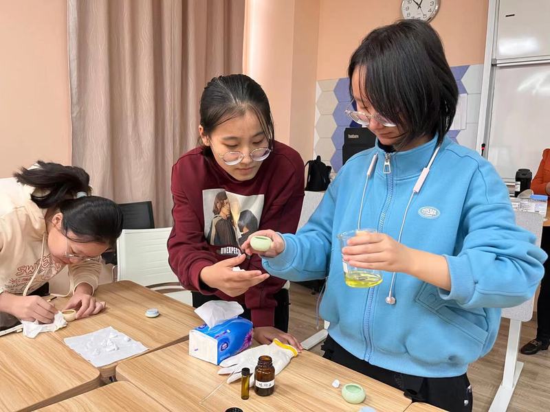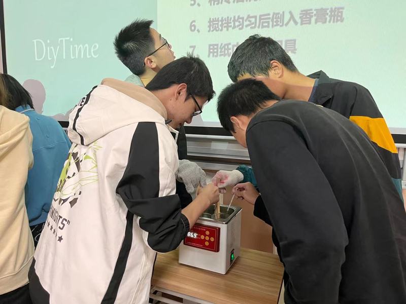 除了脑力劳动学习,郑老师引导同学们体会制作方式等体力劳动内容,同学们兴致勃勃的学习了操作要点,期待着制作出自己的劳动成果接着,同学们井然有序地开始了沁神膏的制作从加热融化植物油和蜂蜡到搅拌加入植物精油大家相互协作体验制作过程,完成了精致的沁神膏作品。