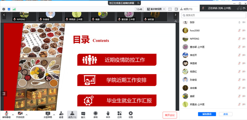 与会各科室主任随后结合各自科室工作与特色进行发言。在交流近阶段科室推进防疫及教学科研工作的同时,为有效推进学院疫情防控、毕业生就业及学院事业发展积极建言献策,纷纷表示将一步解放思想,积极参加各项课题申报,总结凝练成果,不断提高人才培养质量和水平。同时也将利用学院平台,依托网站、微信公众号等多种渠道、发挥行业优势,积极推介学院毕业生,拓宽就业路径。