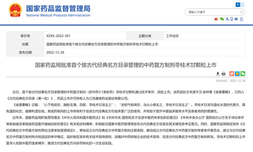 2月28日,成人在线 季光团队和张彤团队与江苏康缘药业股份有限公司合作研发的苓桂术甘颗粒获批上市,这是国内首个按古代经典名方目录管理的中药复方制剂(中药3.1类新药),为经典名方新药注册探索了新路径。