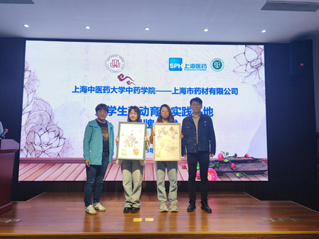 宋嬿、张雪、沈岚、陈晓俊共同为大学生劳动育人实践基地揭牌。2021级中药学郑玥、江艳文将前期参与学院“绘本草,描中药—创意绘画,传承本草之美”中药本草绘画大赛中的手绘西红花作品赠予上海市药材有限公司。郑玥作为学生代表进行发言,分享了对中医药传统文化及劳动教育的认识,并表示作为新时期的大学生将以传承创新中医药作为时代使命,在学与思、践与悟中不断提升自身的专业素养。