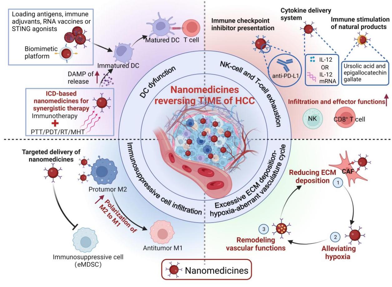 近日,成人在线 胡凯莉研究员团队在生物材料领域顶级国际期刊Biomaterials上发表题为Nanomedicines for reversing immunosuppressive microenvironment of hepatocellular carcinoma的综述文章。该文总结了纳米药物逆转肝细胞癌(hepatocellular carcinoma,HCC)免疫抑制微环境治疗策略的最新进展,为提高HCC免疫疗法效率以及推动HCC治疗纳米药物进入临床转化提供参考。