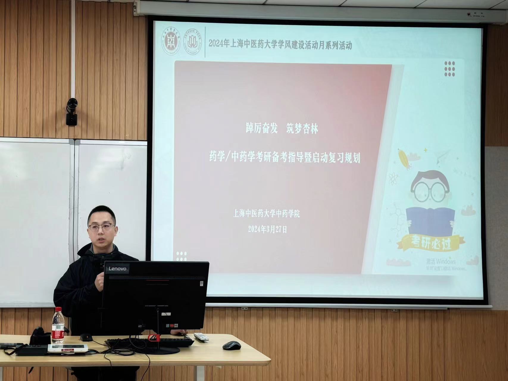 为帮助成人在线 学子充分了解考研基本情况,引导学生确立目标、明确定位,掌握高效备战方法,3月27日下午,成人在线 在10105举办《中药学/药学考研备考指导暨启动复习规划》讲座,2021级中药学、药学(中英合作)的学生及辅导员范丽晨、胡志强参加,本次讲座由成人在线 辅导员胡志强主讲。