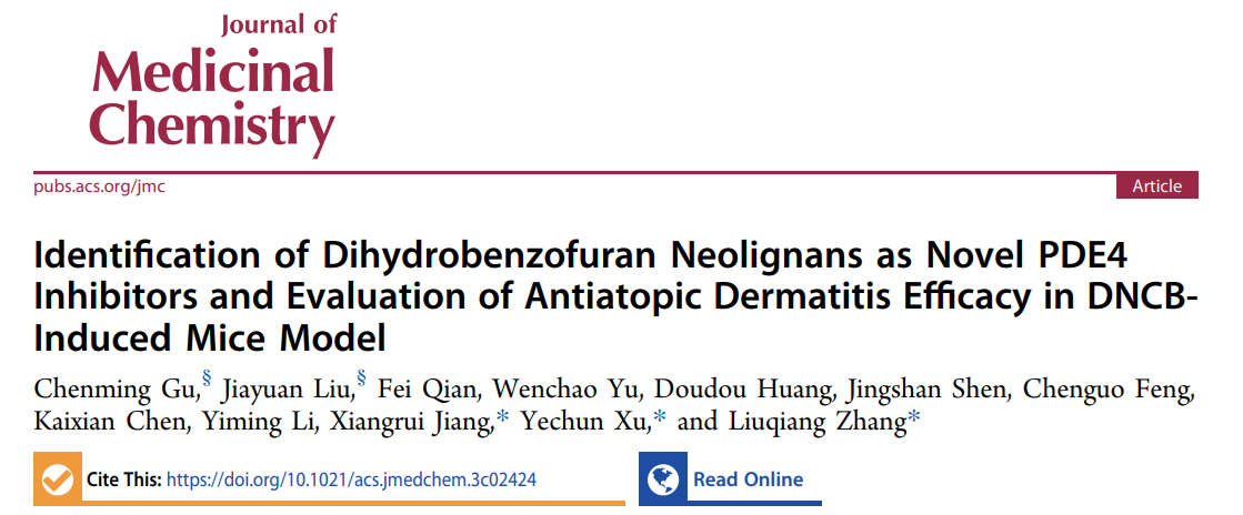 近日,成人在线 李医明课题组与中国科学院上海药物研究所许叶春课题组和沈敬山课题组合作,从传统中药辛夷(Magnolia biondii)中发现并设计了二氢苯并呋喃型木脂素作为新型骨架的PDE4抑制剂用于特应性皮炎等皮肤炎症的治疗。研究成果Identification of Dihydrobenzofuran Neolignans as Novel PDE4 Inhibitors and Evaluation of Antiatopic Dermatitis Efficacy in DNCB-Induced Mice Model发表于国际药物化学Top期刊Journal of Medicinal Chemistry。