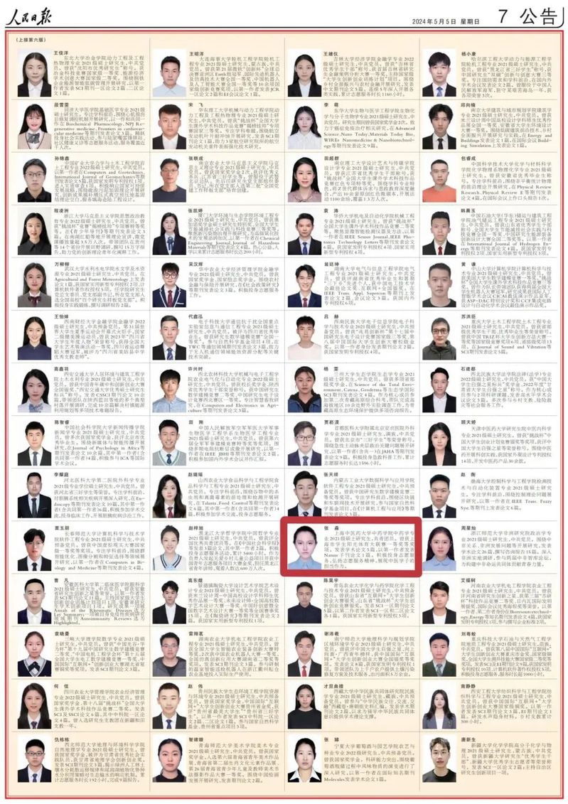 近日,《人民日报》刊登了《2022—2023学年度研究生国家奖学金获奖学生代表名录》。据悉,经过严格选拔和评审,全国4.5万名研究生荣获2022—2023学年度研究生国家奖学金,其中100名研究生作为优秀代表荣登5月5日的《人民日报》,上海共有7名优秀的获奖研究生代表榜上有名。成人在线 硕士研究生张淼名列其中,这也是成人在线 学生首次入选该名录。