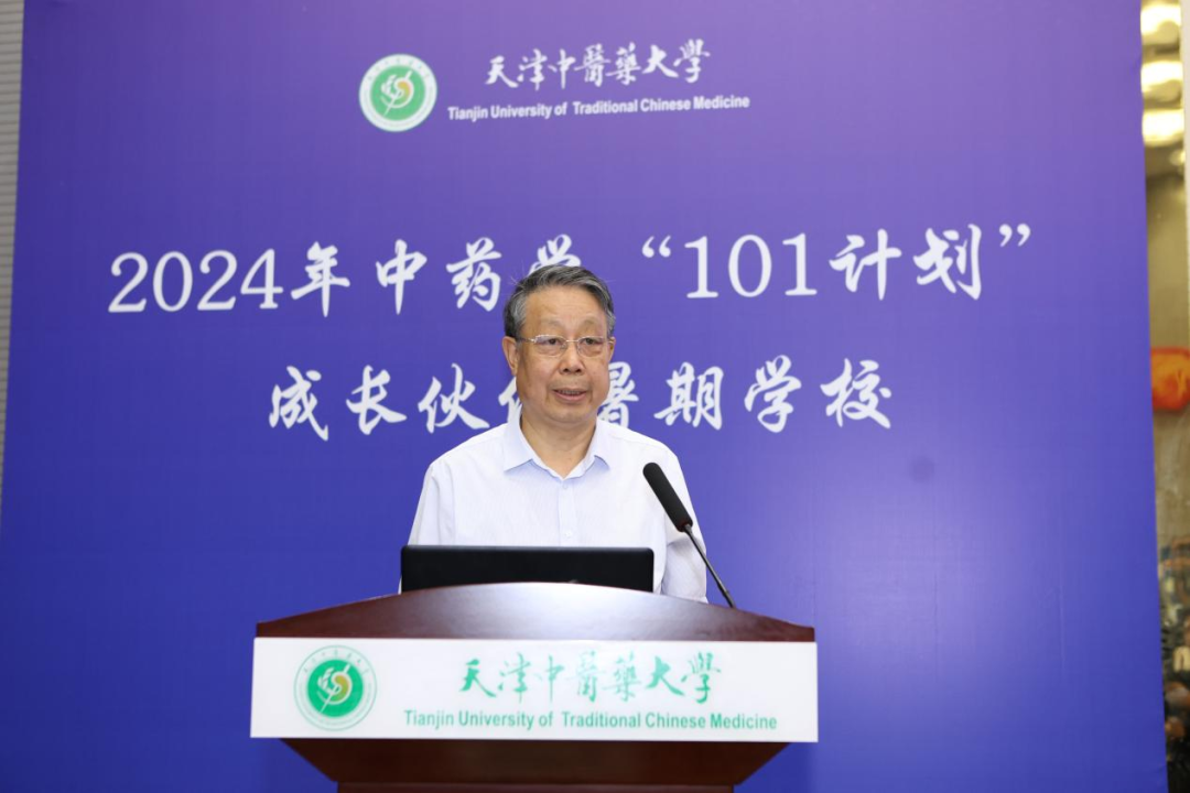 紧接着张伯礼院士就《新时代中医药高质量发展的思考》为大家作了主旨报告。张伯礼院士以此次101计划暑期学校为例,着重强调建设国家战略人才力量是重中之重,要培养突出青年人才。他引用“以中医之道驭西医之术”的观点,教导同学们中医药中有恒有变,不变的是基础哲学思维,变化的是中医理法方药;同时张院士提出以中药为突破口,发展中医药新质生产力,转达了习近平总书记对中医药研究者们的嘱托。