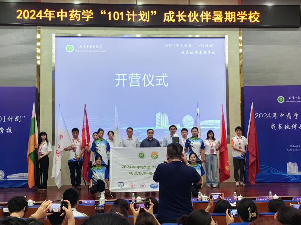 接下来举行了隆重的迎旗仪式,由张伯礼院士宣布首届中药学“101计划”成长伙伴暑期学校正式开营,各校教师代表携旗与领导们合影留念。