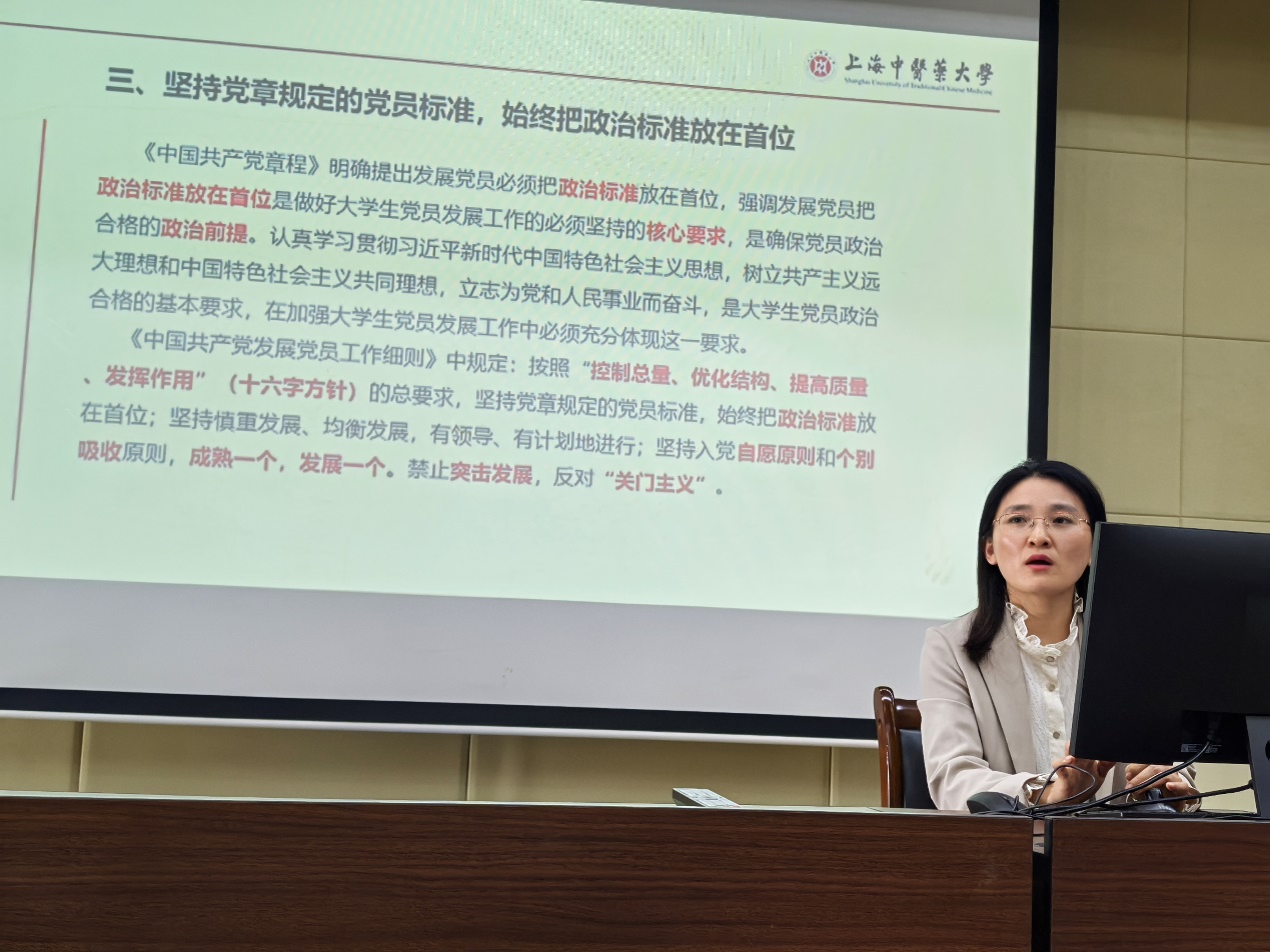 何丹丹介绍了中国共产党的基本情况,和正确的入党动机。并引导新生学习党章,坚持将政治标准放在首位是成为一名合格党员的核心要求。