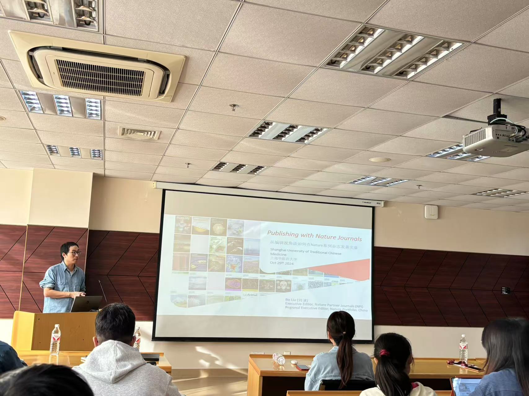刘波博士从编辑的角度出发,介绍了Nature系列杂志的概况、审稿流程、科技论文的写作技巧;另外,也详细介绍了编辑如何筛选稿件以及在审稿过程中的决策过程。报告结束后,与会师生与刘波博士就中医药类研究如何选题更受高水平期刊编辑青睐及论文写作投稿过程中应该注意的问题进行了深入的讨论与交流。