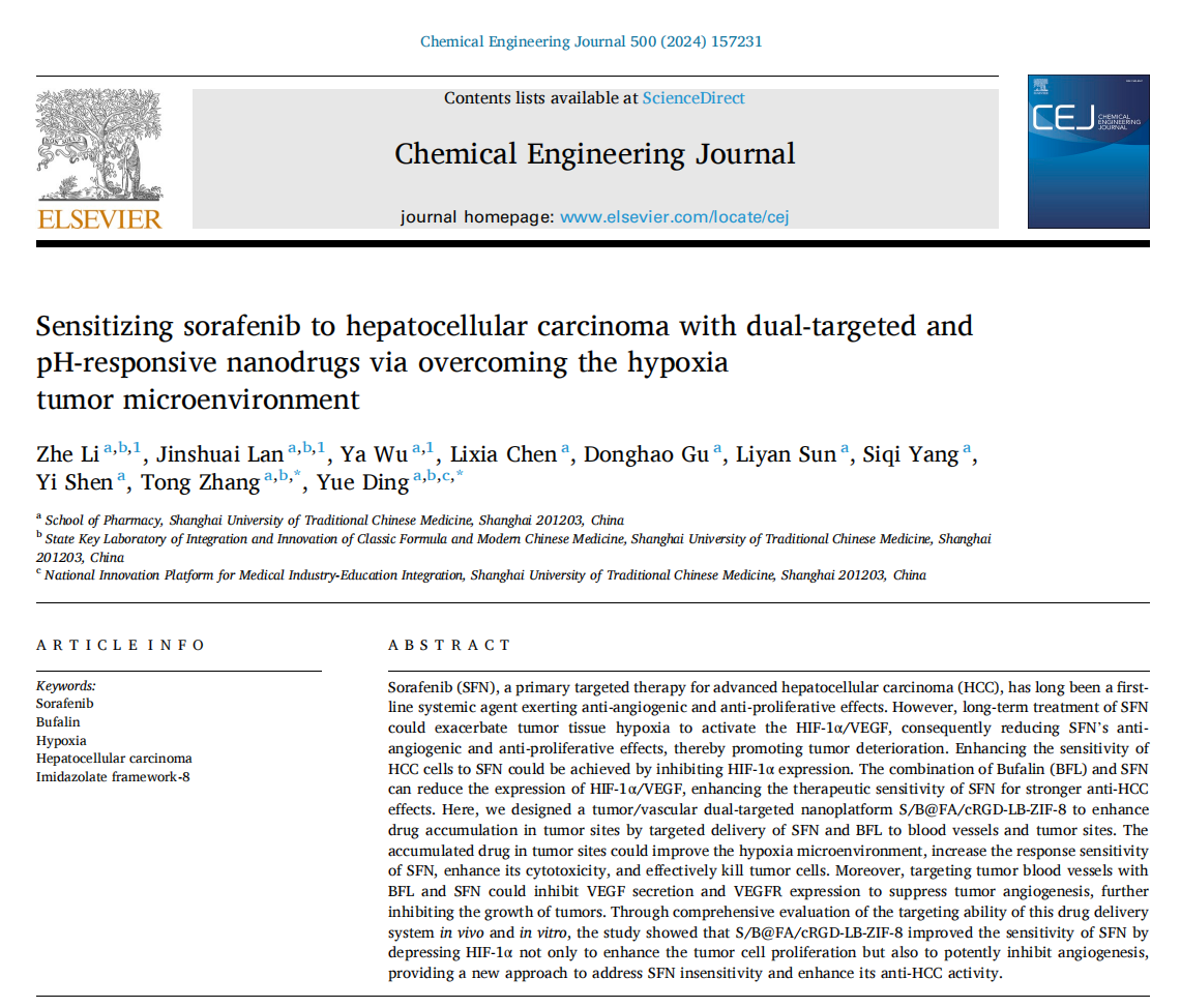 近日,成人在线 张彤教授/丁越研究员团队在国际知名期刊Chemical Engineering Journal上发表了题为“Sensitizing sorafenib to hepatocellular carcinoma with dual-targeted and pH-responsive nanodrugs via overcoming the hypoxia tumor microenvironment”的研究论文(DOI://doi.org/10.1016/j.cej.2024.157231)。该研究构建了一种肿瘤-血管双靶向纳米递药系统用于中药蟾酥中活性成分蟾毒灵(Bufalin,BFL)和肝癌治疗一线药物索拉非尼(Sorafenib,SFN)的靶向递送,通过改善肿瘤乏氧微环境和调控血管生长抑制肿瘤细胞增殖,诱导肿瘤细胞凋亡,增强SFN与BFL的协同抗肝癌作用。研究成果将中药与现代高效递药系统相结合,为改善索拉非尼长期用药引起的肝癌治疗敏感性降低提供新策略。