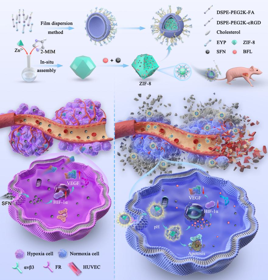 通过构建FA/cRGD双靶头修饰脂质体包覆的沸石咪唑骨架-8纳米递送系统S/B@FA/cRGD-LB-ZIF-8,可实现靶向共递送SFN和BFL至血管以及肿瘤部位,增强药物在肿瘤血管和肿瘤部位的聚集。该制剂还具有缓释和pH响应释药能力,达到肿瘤部位后释放药物,通过改善肿瘤乏氧微环境、抑制血管生长和诱导肿瘤细胞凋亡,增强SFN与BFL的协同抗肝癌作用。