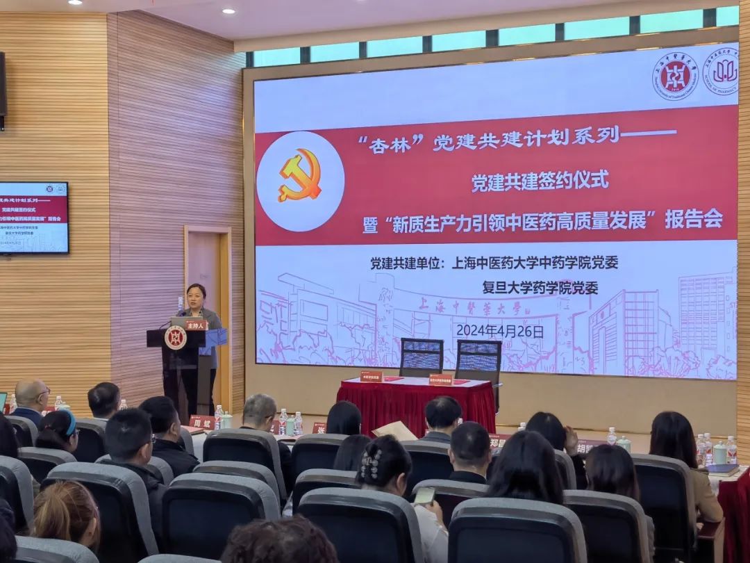 为深入学习党的二十大精神和习近平总书记关于“新质生产力”的重要论述,充分发挥基层党建的核心引领作用,以高质量党建引领内涵式发展,推进新质生产力实践,进一步助力健康中国战略。4月26日,成人在线 党委与复旦大学药学院在全球合作伙伴中心一楼报告厅开展党建共建签约仪式暨“新质生产力引领中医药高质量发展”报告会。成人在线 党委副书记周斌出席本次会议,复旦大学药学院党委书记王建新、副书记史雪茹和王盛,成人在线 党委书记沈岚、院长张彤、副书记陆婧、副院长郑昌武和胡凯莉以及双方师生党员等共计100余人参加。会议由成人在线 党委书记沈岚主持。