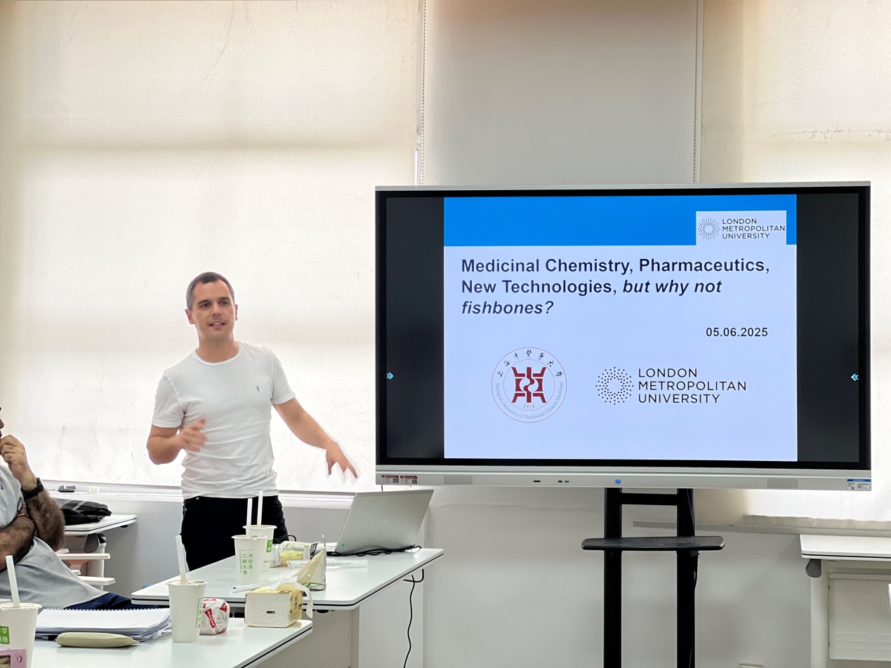 随后,英方教师Dr. Bhaven Patel和Dr. Bruno Sil dos Santos分享了他们的研究经历和成果。Dr. Bhaven Patel介绍了团队在有机化学合成领域取得的研究成果,详细探讨了具有多重生物活性的马里诺喹啉和有机磷类衍生物的合成策略,并指出流动化学技术在提升药物合成效率方面的重要贡献。Dr. Bruno Sil dos Santos分享了自己跨学科研究的经历,重点介绍了3D打印技术在化学领域的创新应用。研究团队从基础模型打印逐步发展到复杂设备研发,如便携式光谱仪和药物载体材料,并探索了环保型材料及药物渗透技术。他鼓励同学们将自身所学的基础知识应用于新的研究领域,创造性地解决实际问题。分享会后,老师和同学们就感兴趣的问题同英方老师进行了热烈的讨论。