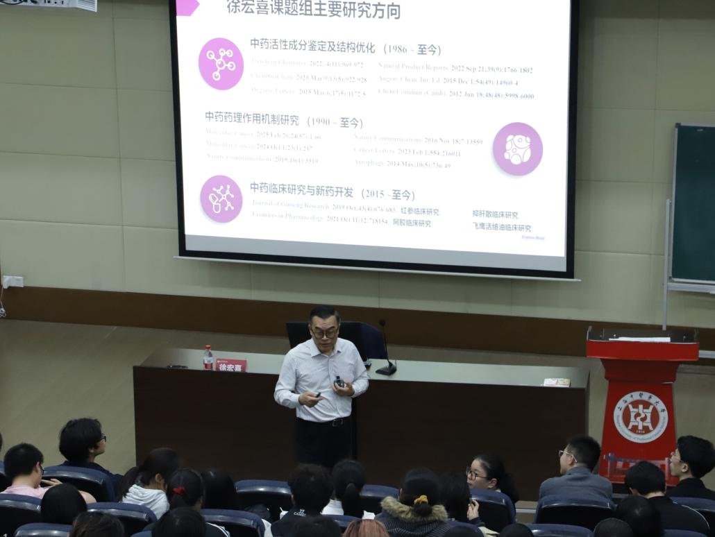 “同学们,你们知道我们咳嗽时常喝的鲜竹沥,到底是什么成分在起效吗?”徐宏喜教授一开场,便以家喻户晓的“鲜竹沥”为例,瞬间点燃了现场气氛。紧接着徐教授从六味地黄丸的多种剂型衍生,一个个生动具体的案例,如同抽丝剥茧,将当前中药研究的现状、热点与面临的挑战清晰地呈现在同学们面前。徐教授贯通中西,引经据典,其讲述既展现了中医药的博大精深,也以国际化的视野指出了其在现代化、科学化道路上必须直面的发展瓶颈,会场不时爆发出会心的笑声和热烈的掌声。