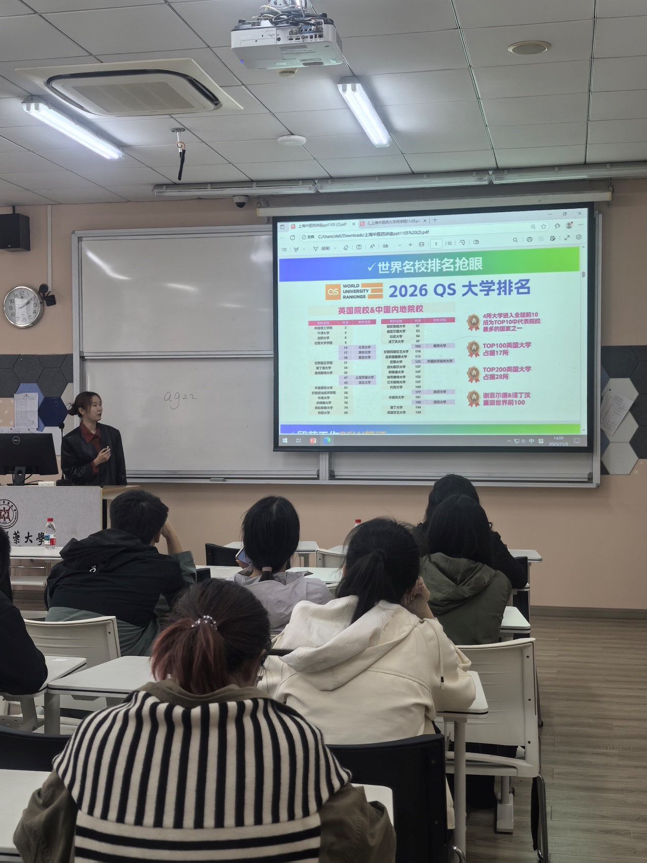 为精准对接毕业生就业升学需求,点亮学子海外深造之路,11月5日下午,成人在线 在 10206教室成功举办了一场内容丰富、干货满满的出国留学专题讲座。本次活动特邀新东方资深留学指导老师杨子超、祁莎莎担任主讲,吸引了众多怀揣留学梦想的药学学子到场学习。讲座由辅导员陈秀兰主持。